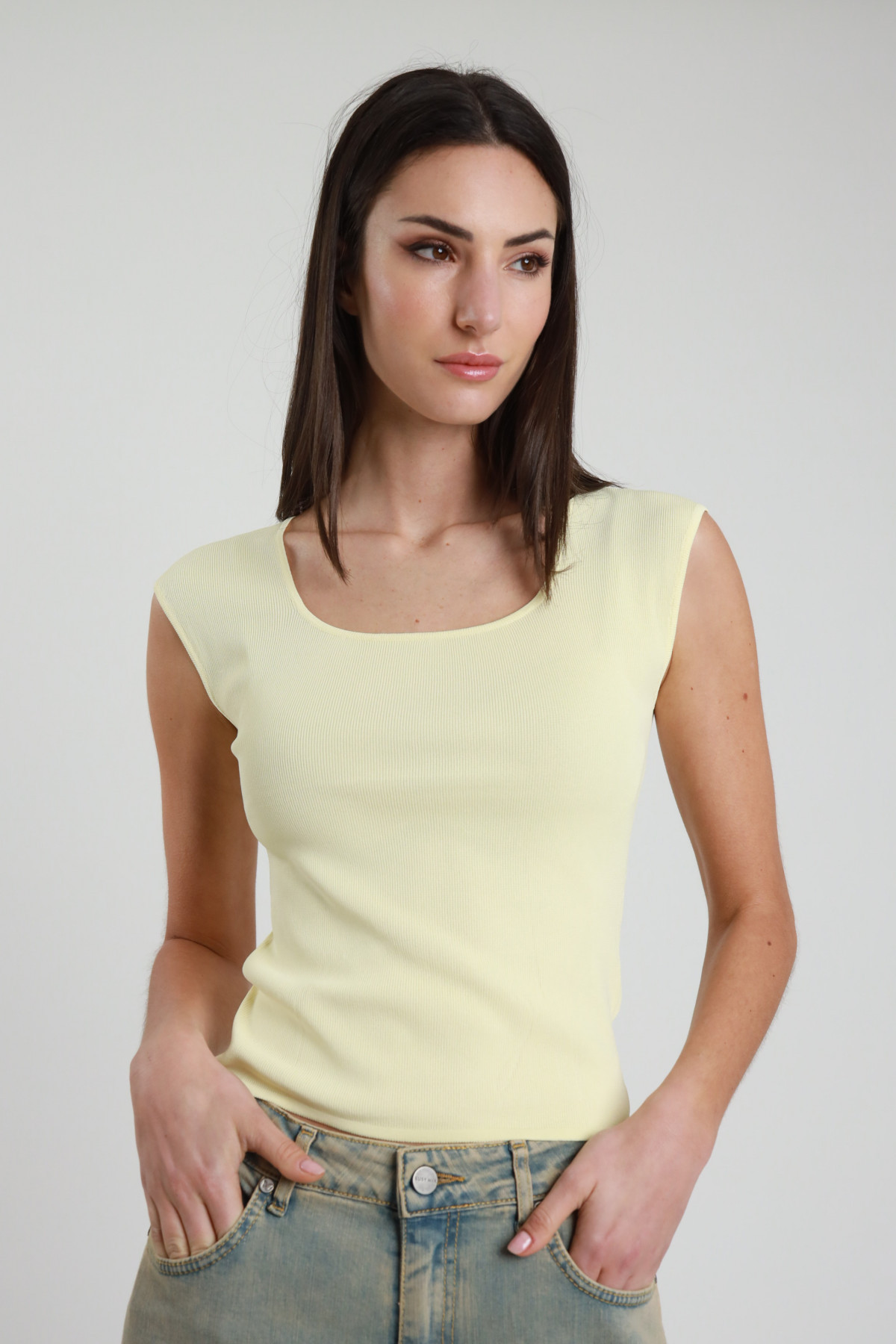 Canotta in Cotone Elasticizzato a Costine con Scollo a Bottoni Gioiello.