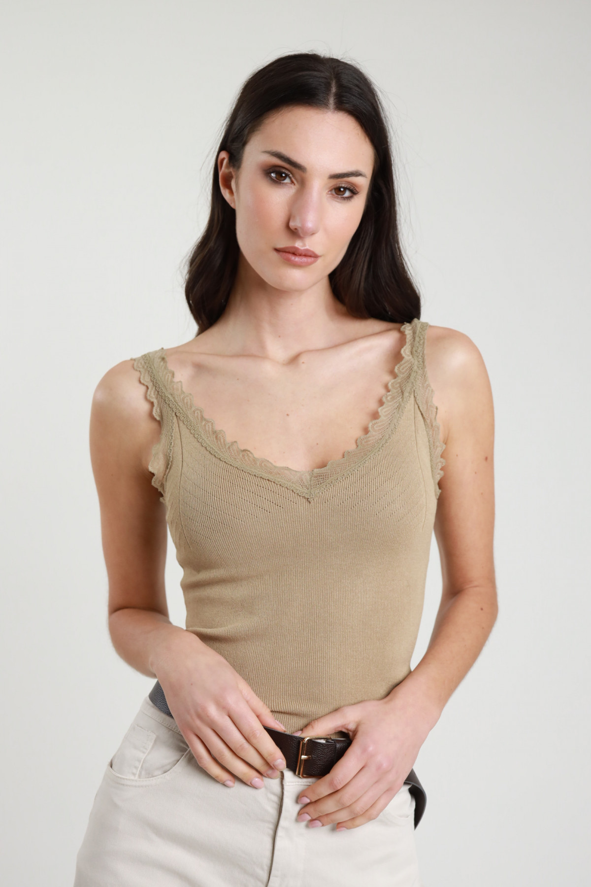 Elastisches Tanktop mit Spitze an den Rändern. 70 %vi 25 %co 5 %ea