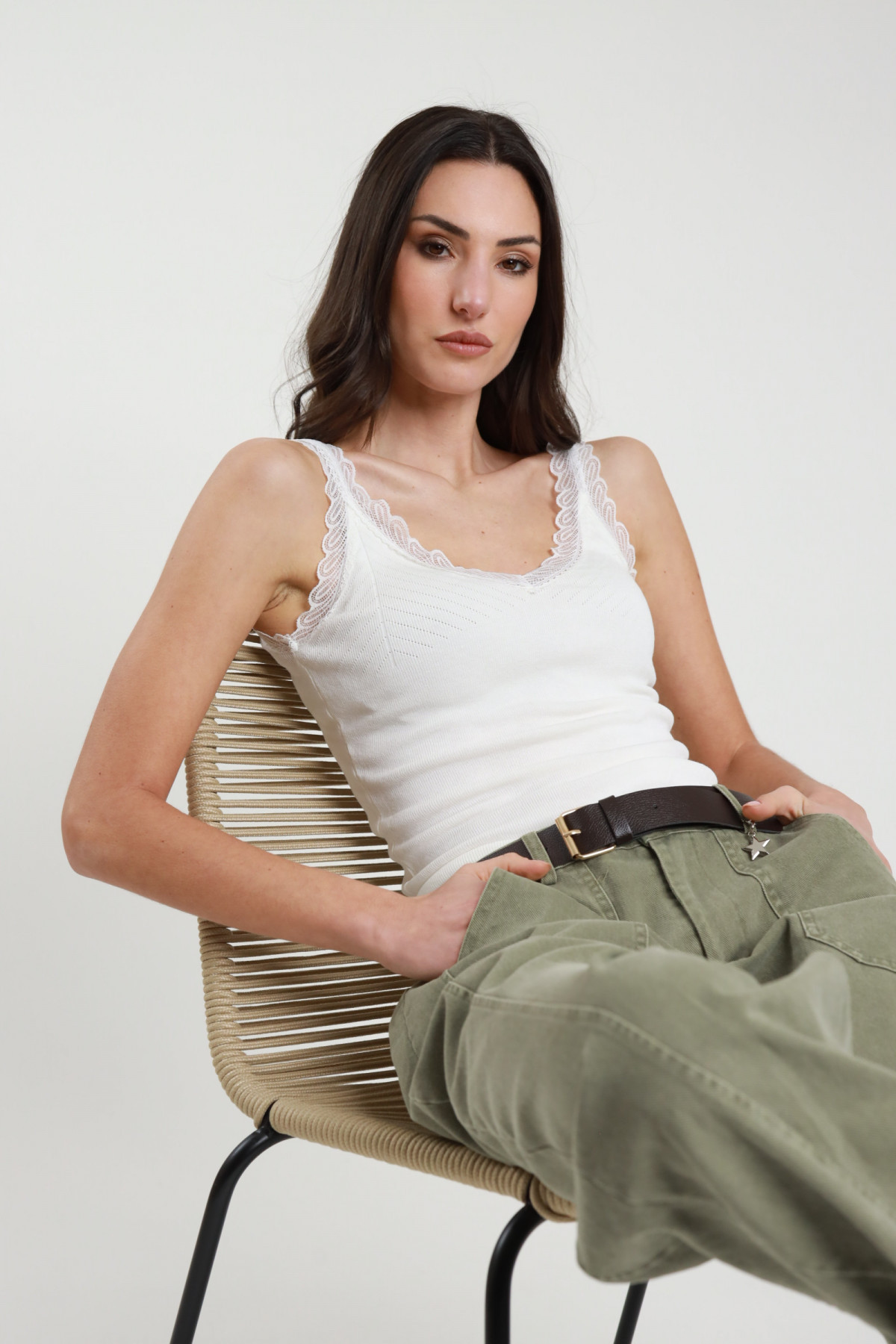 Elastisches Tanktop mit Spitze an den Rändern. 70 %vi 25 %co 5 %ea