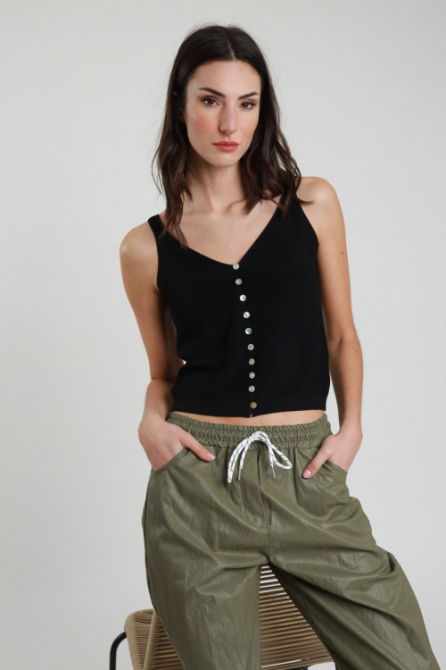 Gestricktes Tanktop mit V-Ausschnitt und Knöpfen vorne. 63%vi 37%ny