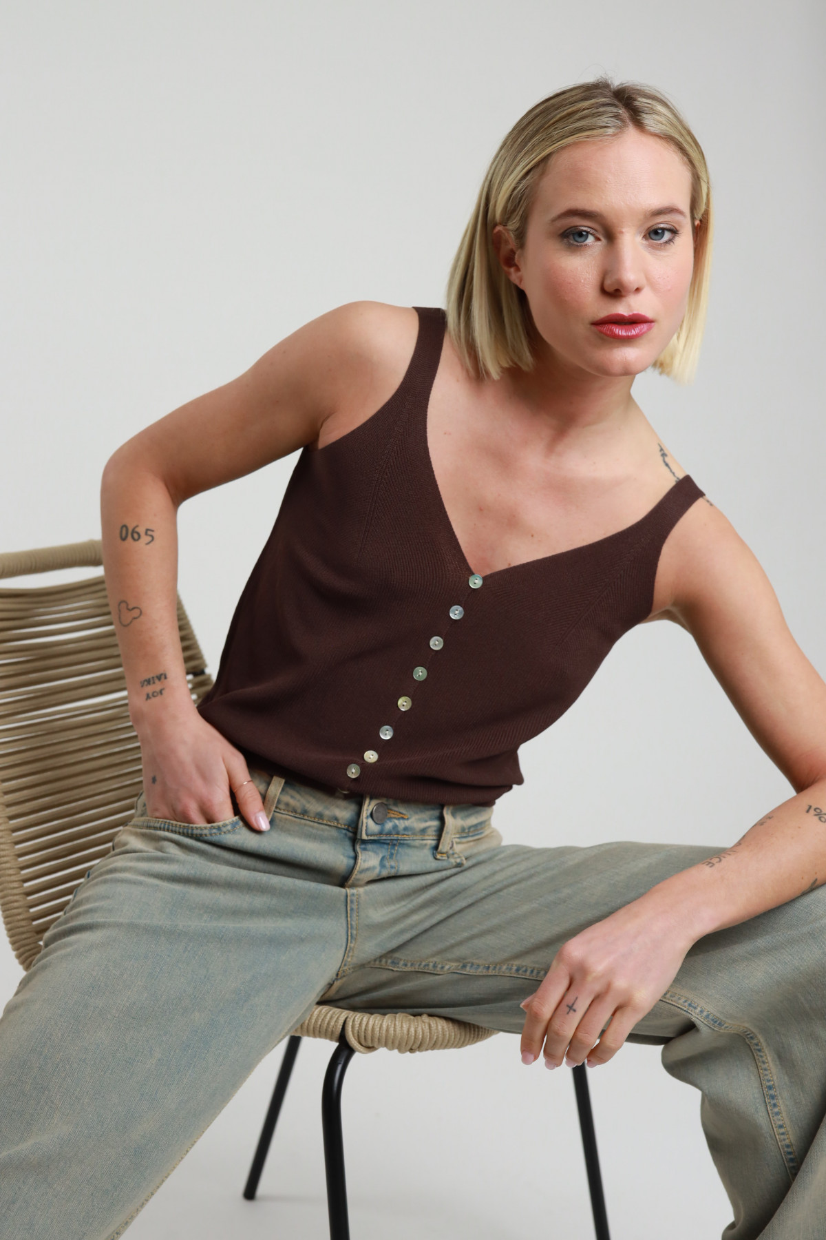 Gestricktes Tanktop mit V-Ausschnitt und Knöpfen vorne. 63%vi 37%ny