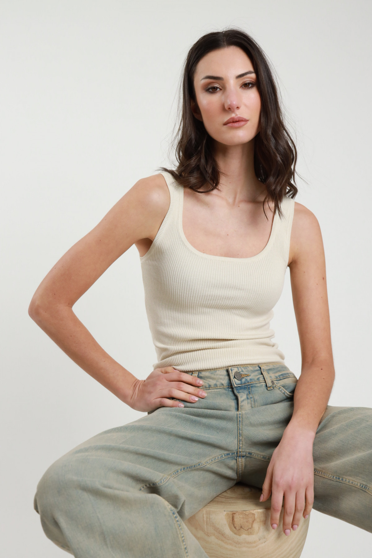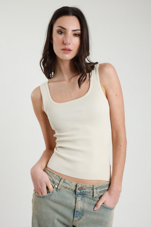 Elastisches, geripptes Tanktop mit quadratischem Ausschnitt. 70 %vi 25 %co 5 %ea