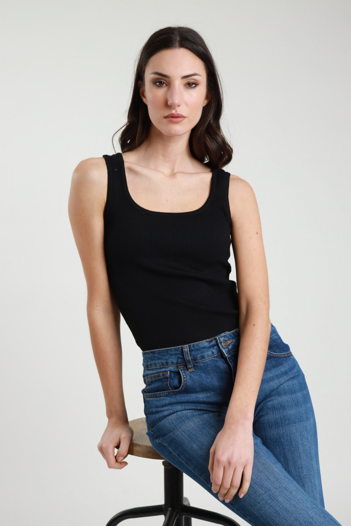 Elastisches, geripptes Tanktop mit quadratischem Ausschnitt. 70 %vi 25 %co 5 %ea