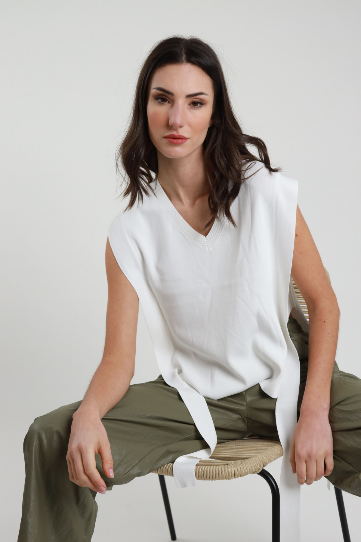 Gestrickte Weste mit Schnürsenkeln, V-Ausschnitt und niedrigem Seitensaum. 63%vi 37%ny