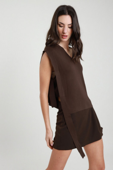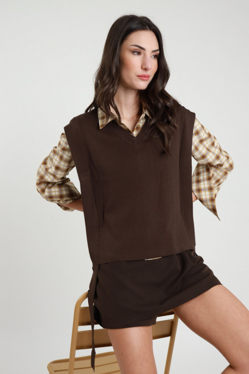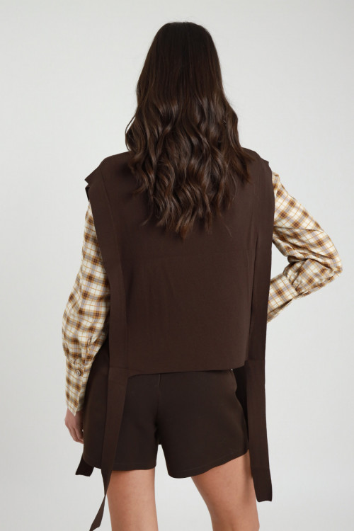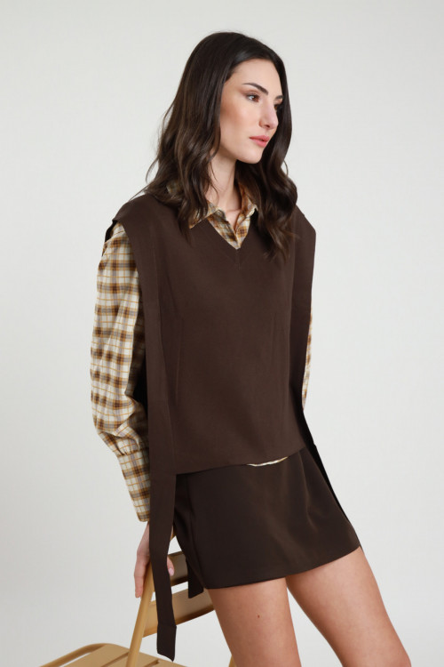 Gestrickte Weste mit Schnürsenkeln, V-Ausschnitt und niedrigem Seitensaum. 63%vi 37%ny