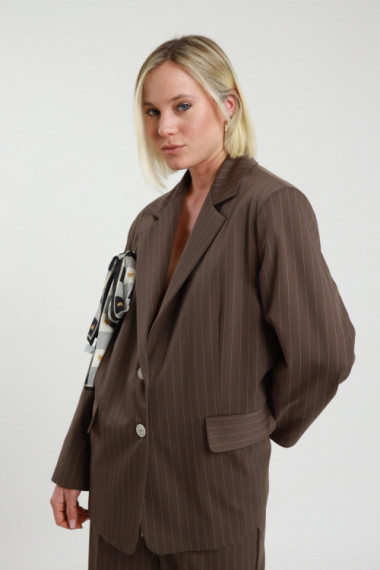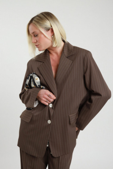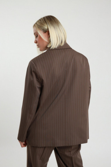 Übergroße Nadelstreifenjacke mit abnehmbarer Schalnadel und Pattentaschen. 78%pl 18%vi 4%ea+100%pl