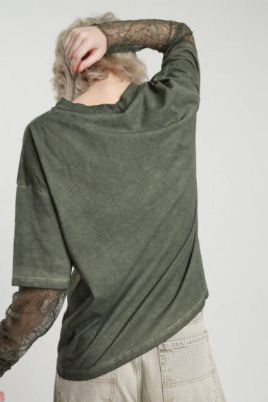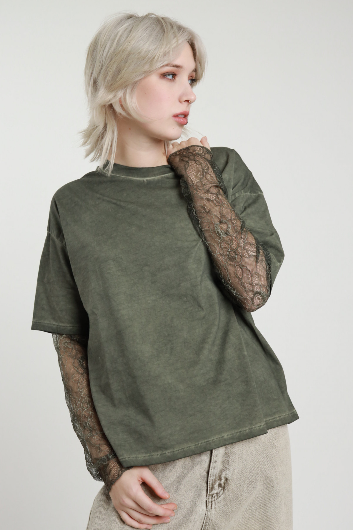 T-Shirt Mezze Maniche Girocollo in Cotone Tinto Freddo, con Maniche Lunghe in Pizzo. 100%co+100%pa