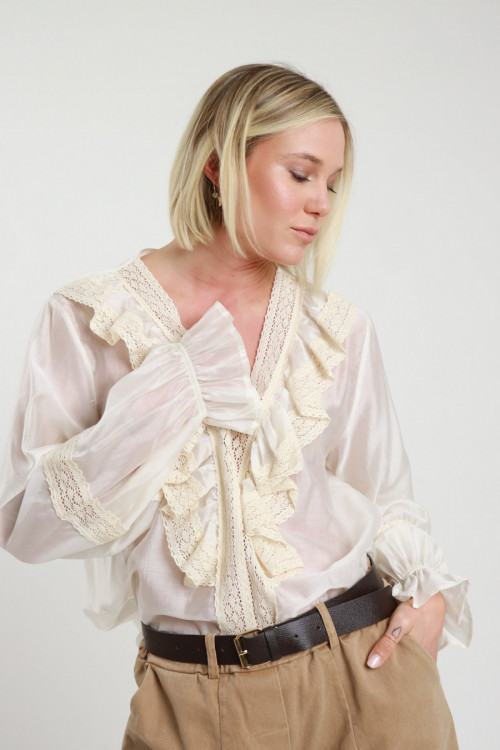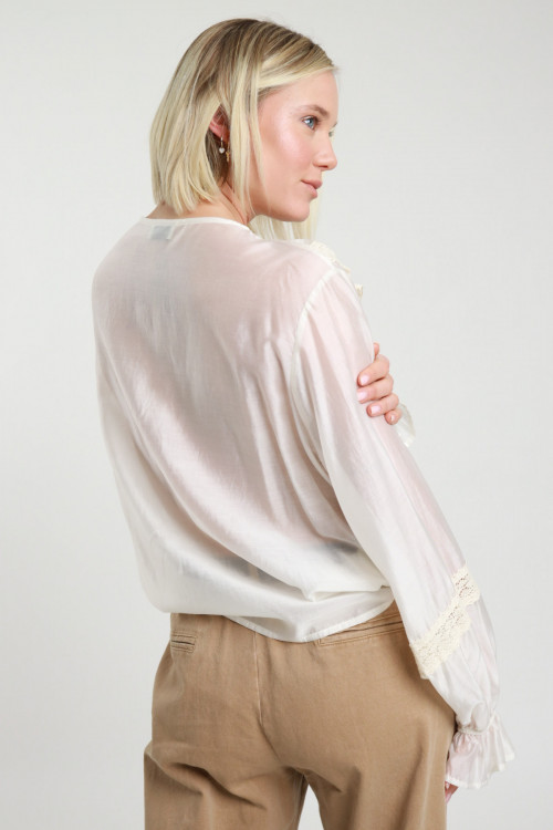 Bluse mit V-Ausschnitt, Rottönen und Spitze vorne, Puffärmel mit Gummizug an den Manschetten. 85 % 15 % pl