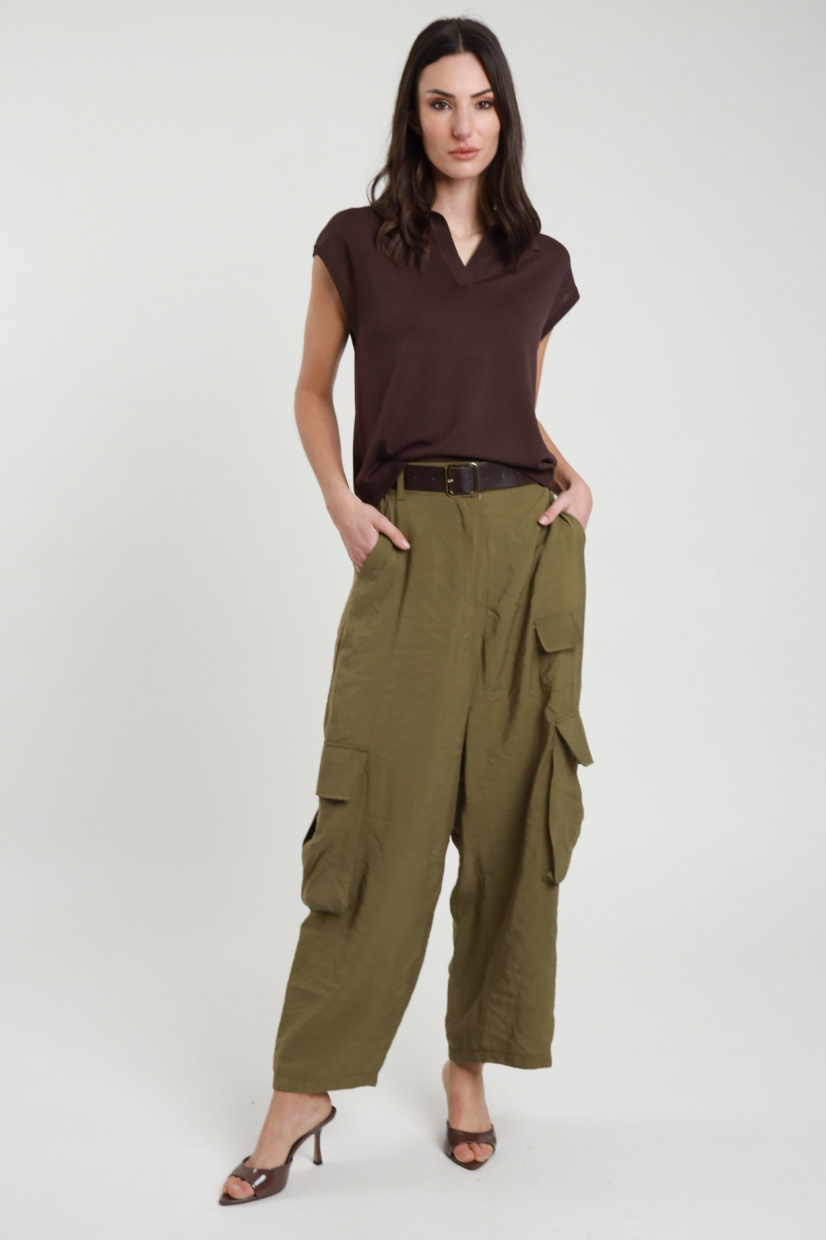 Palazzo trousers with pleats in satin effect viscose, elastic and waist belt with loops, 2 pockets. 100%vi
