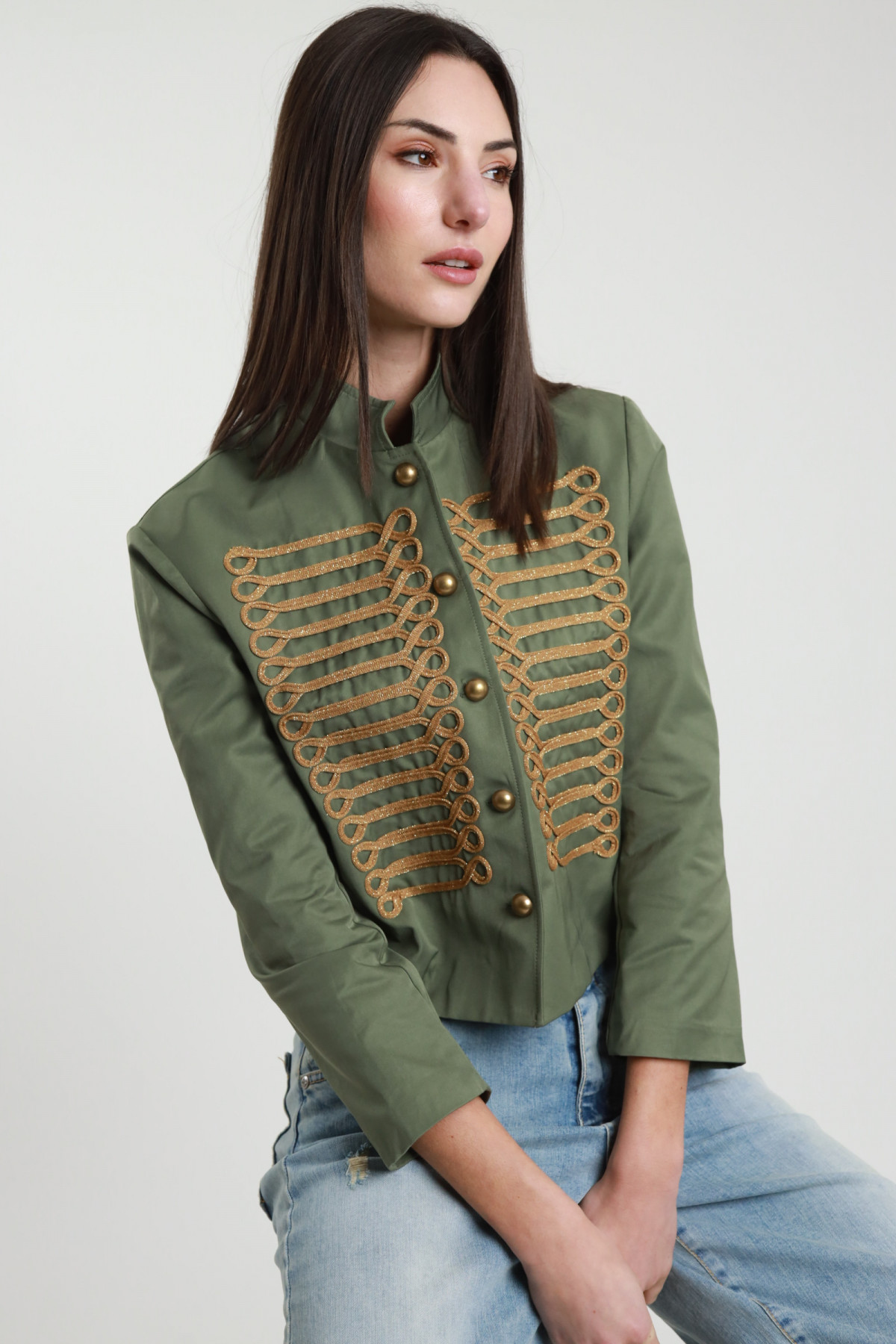 Crop-Jacke mit Kragen und goldfarbener Zirkus-Stickerei, goldfarbener Knopfverschluss. 57%co 34%pl 9%pa+100%pl