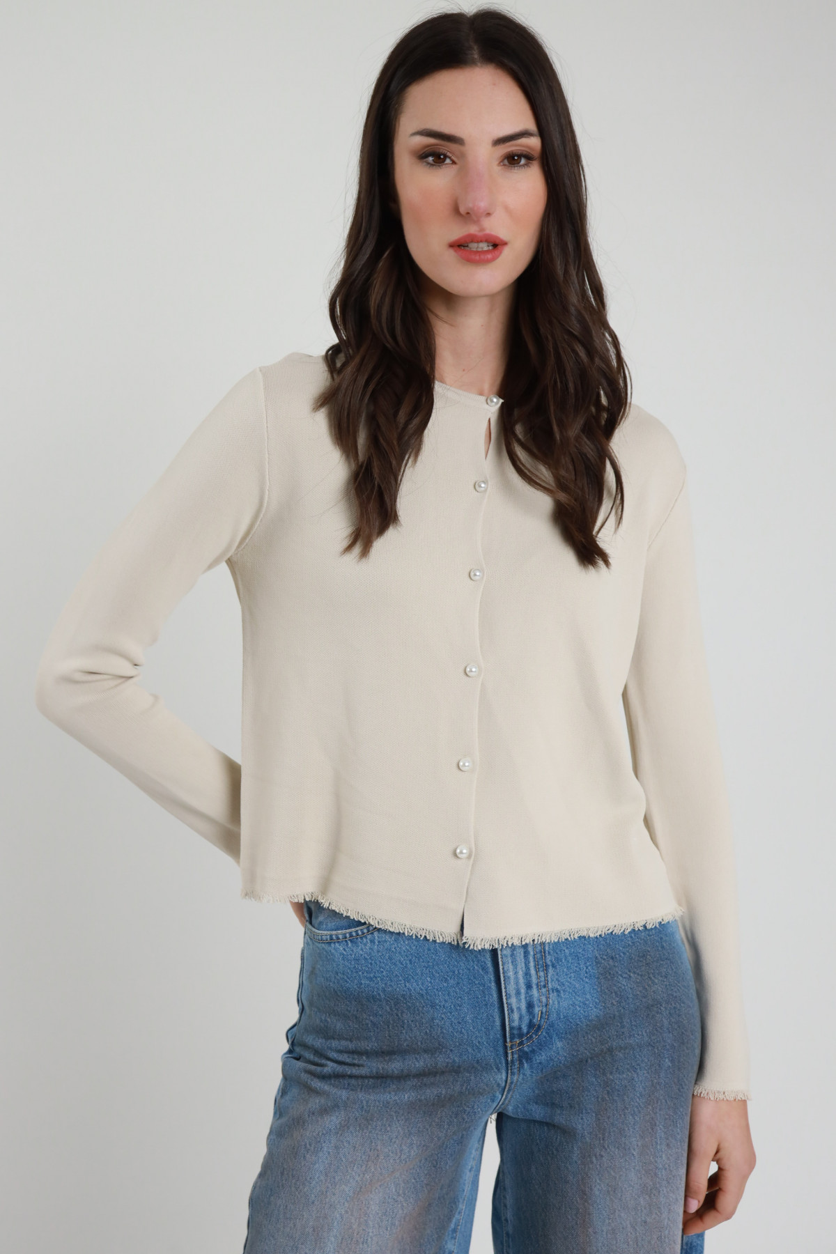 Cardigan Girocollo Con Bottoni Perline, Sfondo Sfrangiatino, Regular Fit. 75%vi 25%pa