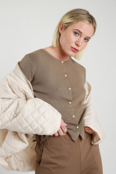 Cardigan Girocollo Con Bottoni Perline, Sfondo Sfrangiatino, Regular Fit. 75%vi 25%pa