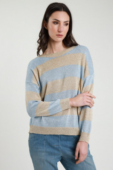 Gestreifter Viskose-Lurex-Pullover mit U-Boot-Ausschnitt und gerippten Kanten. 80 %vi 20 %fm