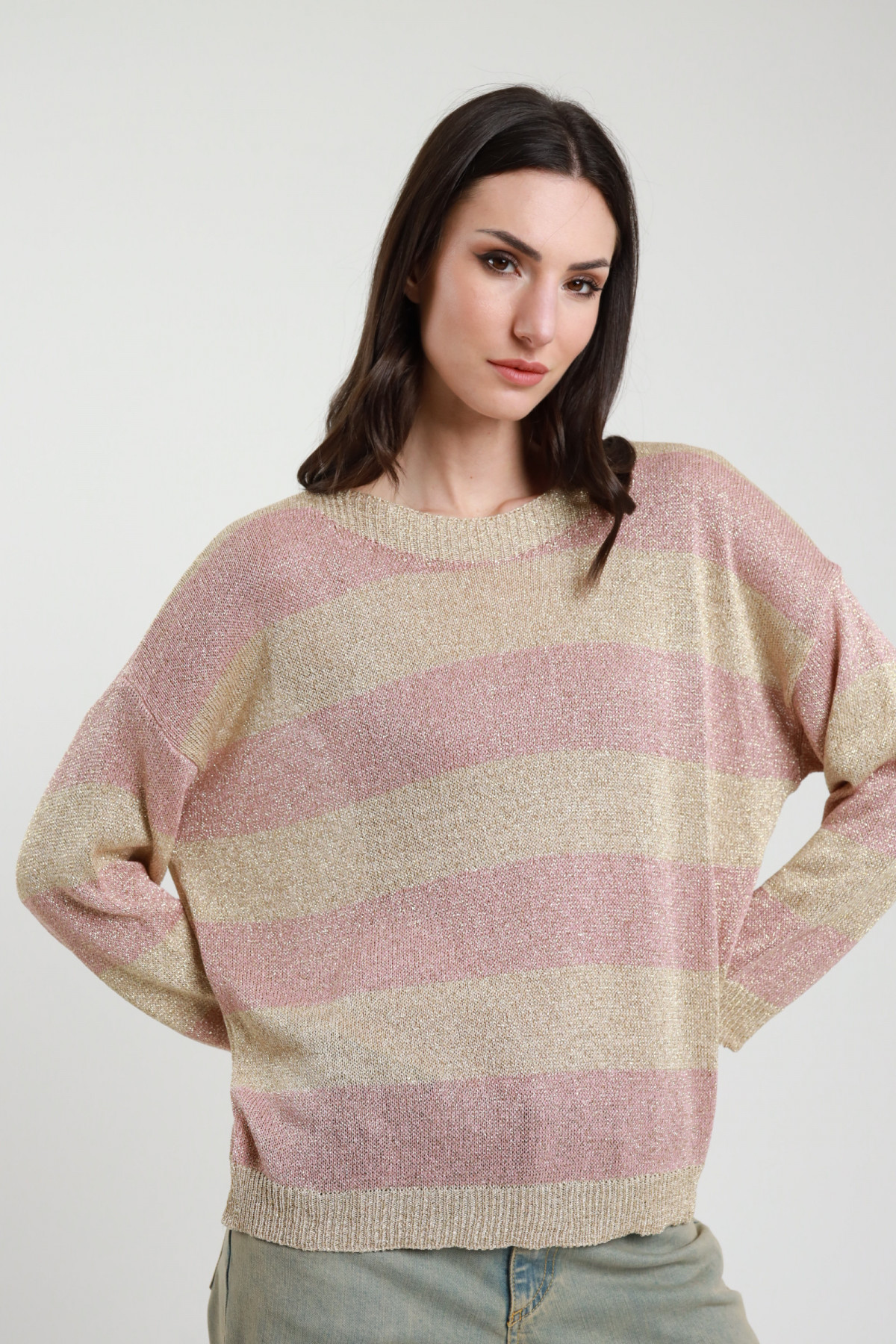Gestreifter Viskose-Lurex-Pullover mit U-Boot-Ausschnitt und gerippten Kanten. 80 %vi 20 %fm