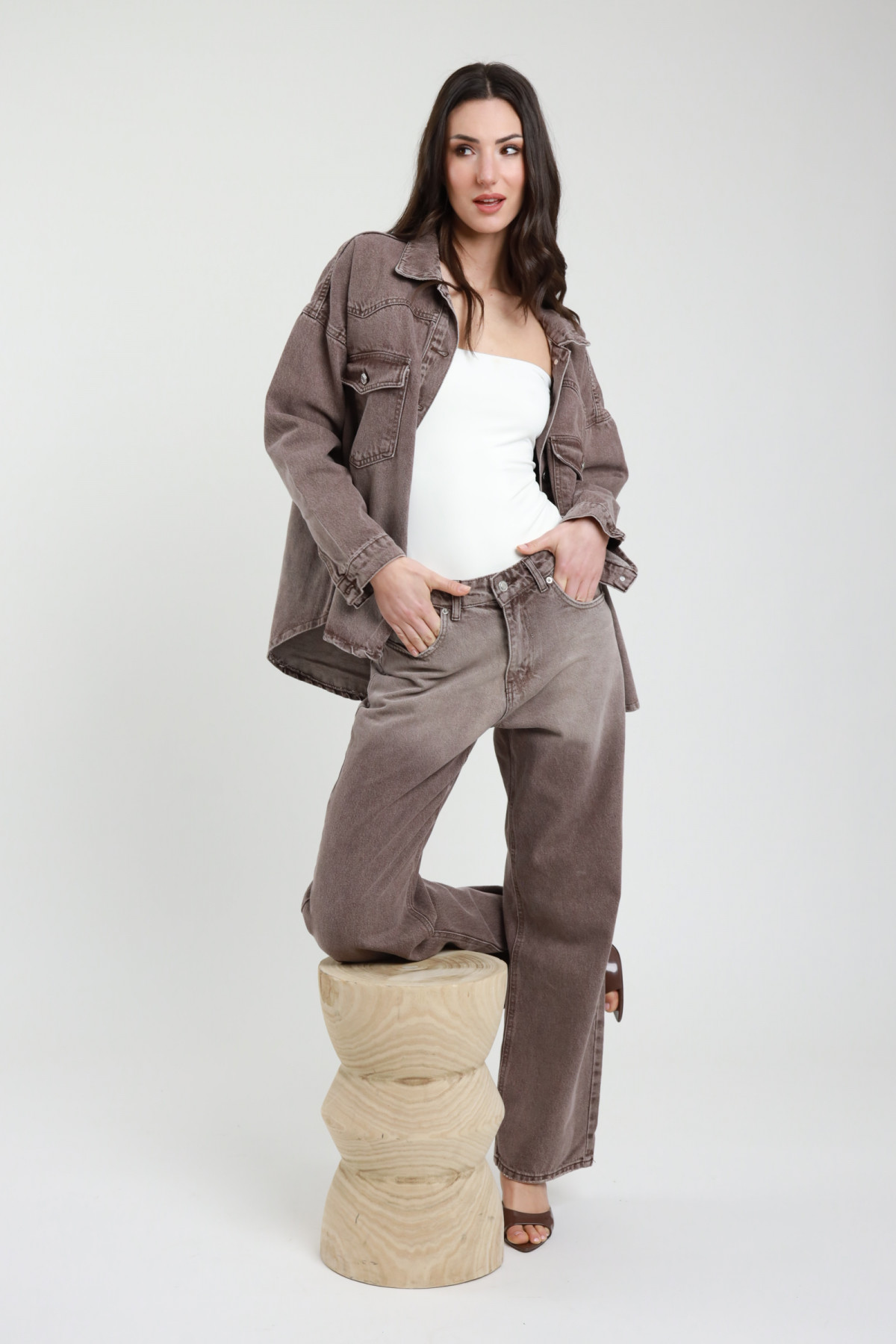 Giacca Camicia Taglio Over in Denim Lavaggio Colorato Marrone con Sbiaditure e Chiusura Bottoni. 100%co