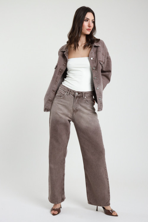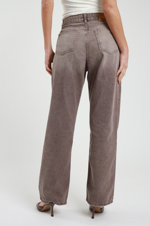 Jeans mit weitem Bein und hoher Taille, braune Waschung mit Fade-Effekten. 100 % co