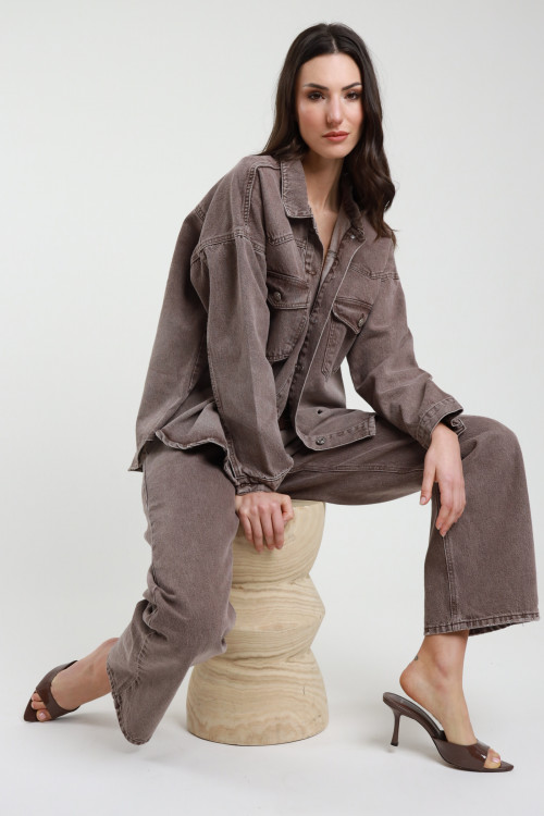 Giacca Camicia Taglio Over in Denim Lavaggio Colorato Marrone con Sbiaditure e Chiusura Bottoni. 100%co