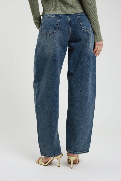 Sonia Mom Fit Jeans mit gewölbter Naht vorne. Marmorierte dunkle Waschung. 5 Taschen. 100 % co