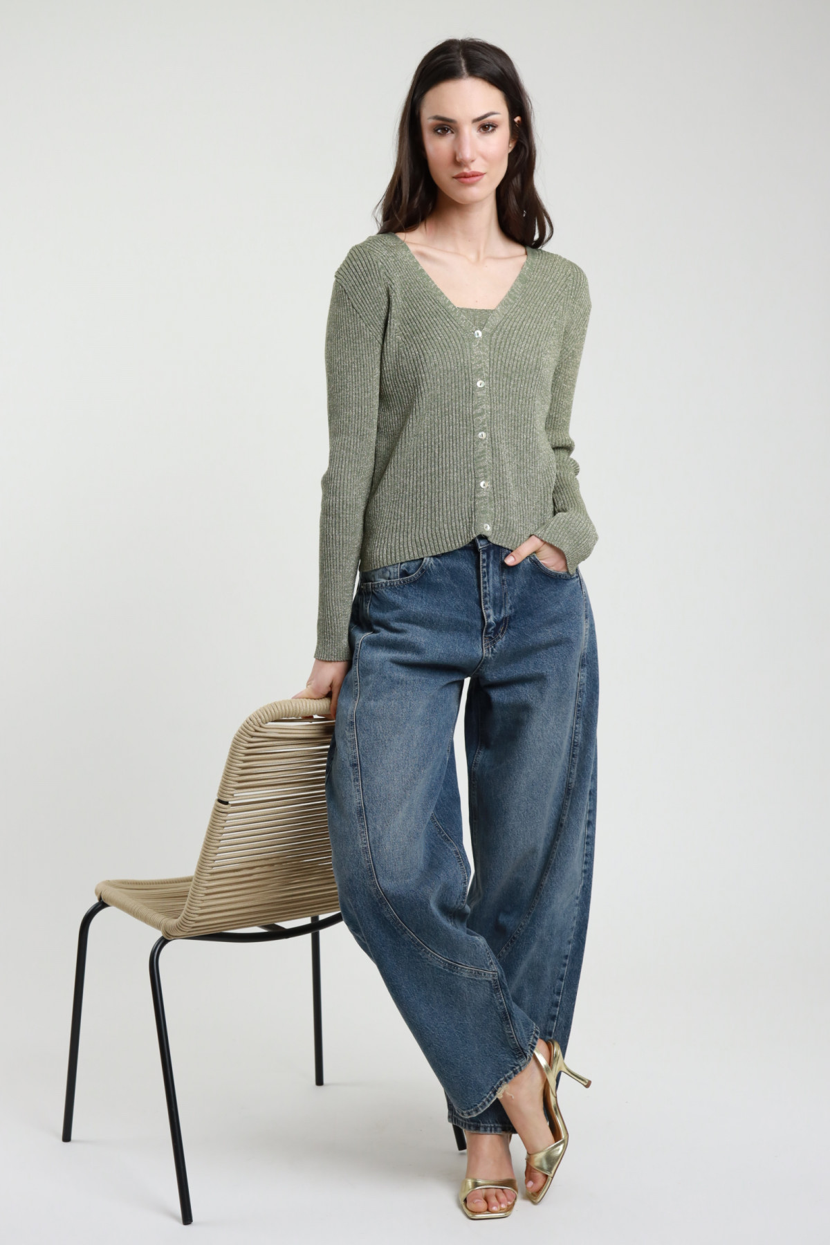 Gerippter Lurex-Cardigan mit Knopfverschluss. 90 %vi 8 %fm 2 %ea