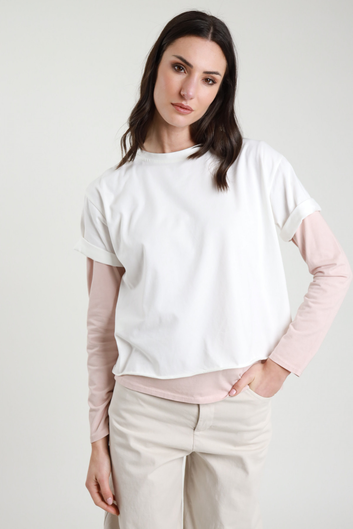 Doppeltes T-Shirt mit langen und halben Ärmeln aus Stretch-Baumwolle, Rundhalsausschnitt. 90 % CO 10 % Stück