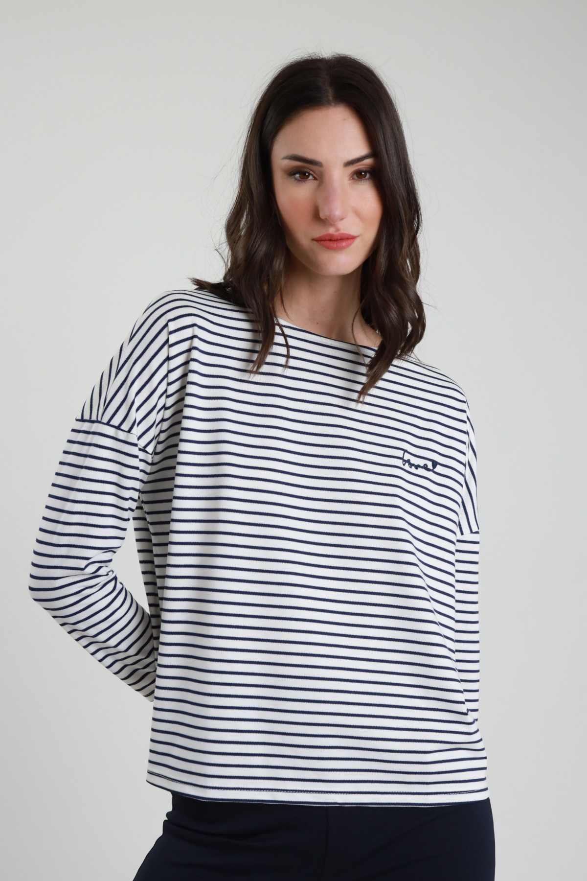 Maglia Manica Lunghe Rigata, Girocollo Leggermente A Barchetta, Spalla scesa, Ricamo Sul Fronte "Love" in Pendant Con Il Colore Delle Righe. 50%vi 25%pl 20%co 5%ea