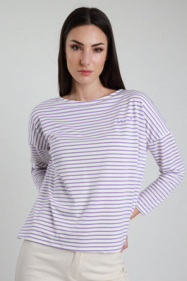 Maglia Manica Lunghe Rigata, Girocollo Leggermente A Barchetta, Spalla scesa, Ricamo Sul Fronte "Love" in Pendant Con Il Colore Delle Righe. 50%vi 25%pl 20%co 5%ea
