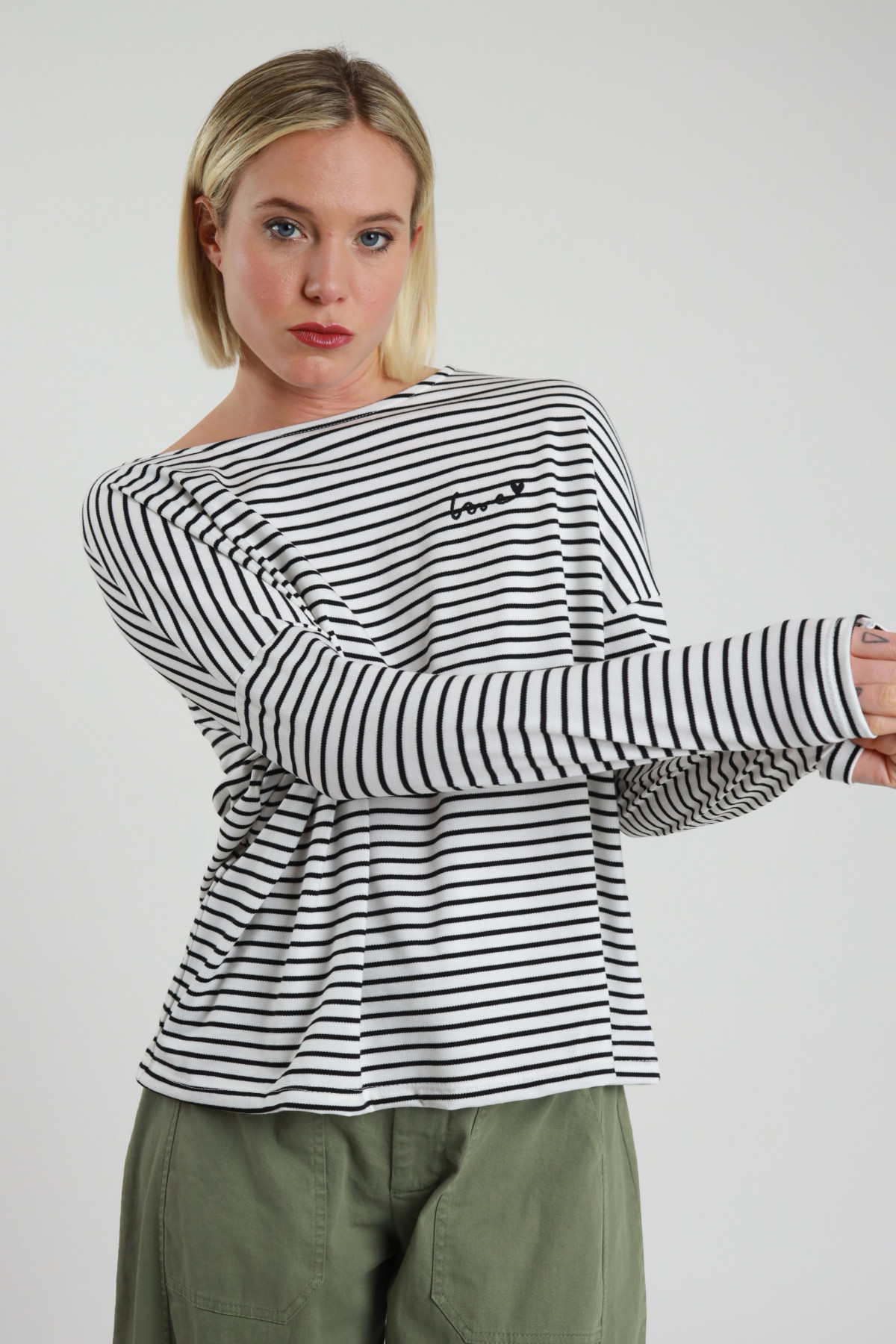 Maglia Manica Lunghe Rigata, Girocollo Leggermente A Barchetta, Spalla scesa, Ricamo Sul Fronte "Love" in Pendant Con Il Colore Delle Righe. 50%vi 25%pl 20%co 5%ea