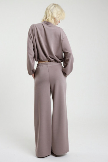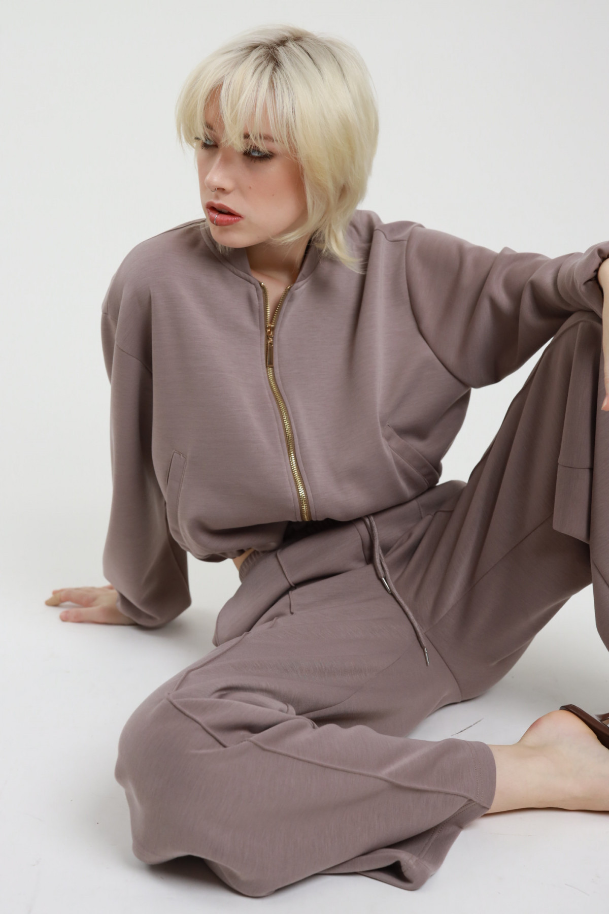 Sweatshirt-Outfit mit Bomberjacke mit goldenem Reißverschluss + Palazzo-Hose mit Gummizug und Kordelzug in der Taille. 84 %pl 11 %ry 5 %ea