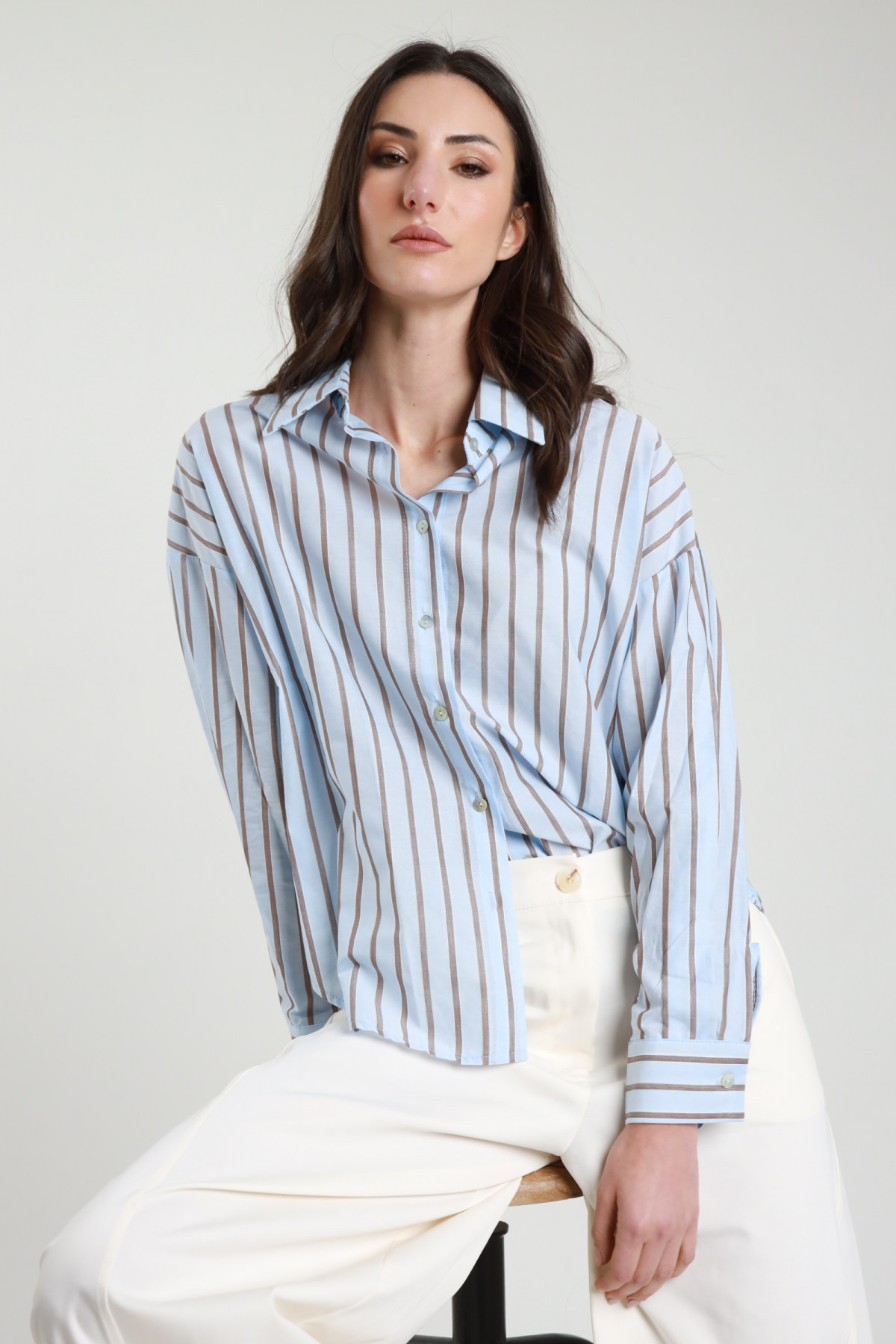 Nadelstreifenhemd mit weitem Ausschnitt, schmaler Passform und Abnähern auf der Vorderseite. 72%co 25%vi 3%ea