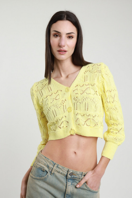 Kurzer Cardigan aus perforiertem Baumwollstrick, 3-Knopf-Verschluss. 50 % CO 50 % AC