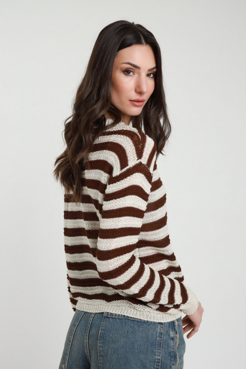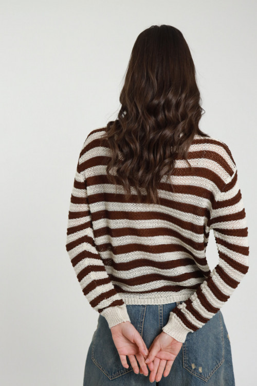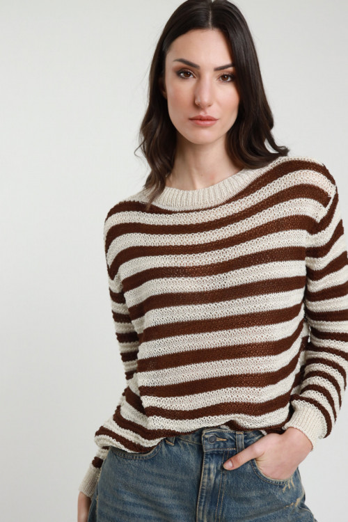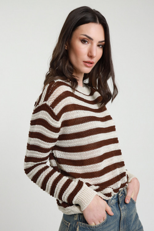Perforierter Rundhalspullover mit Streifenmuster.  50 % CO 50 % AC