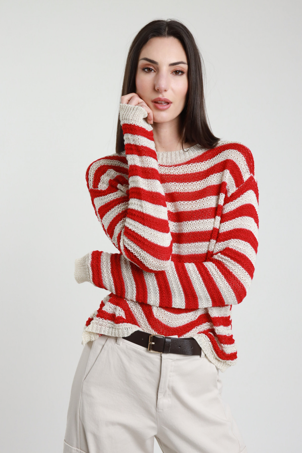 Perforierter Rundhalspullover mit Streifenmuster. 50 % CO 50 % AC