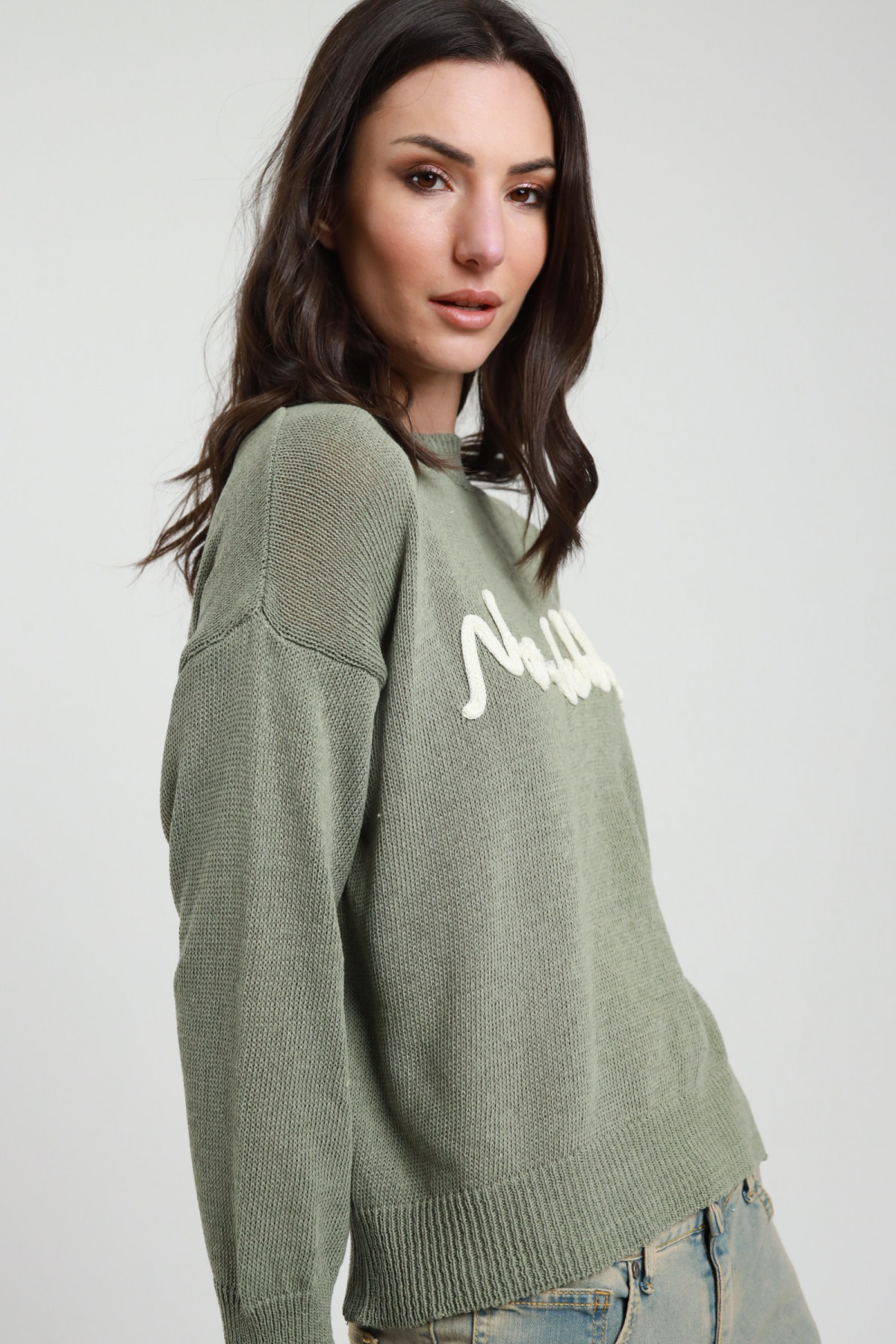Perforierter Rundhalspullover mit Streifenmuster. 50 % CO 50 % AC