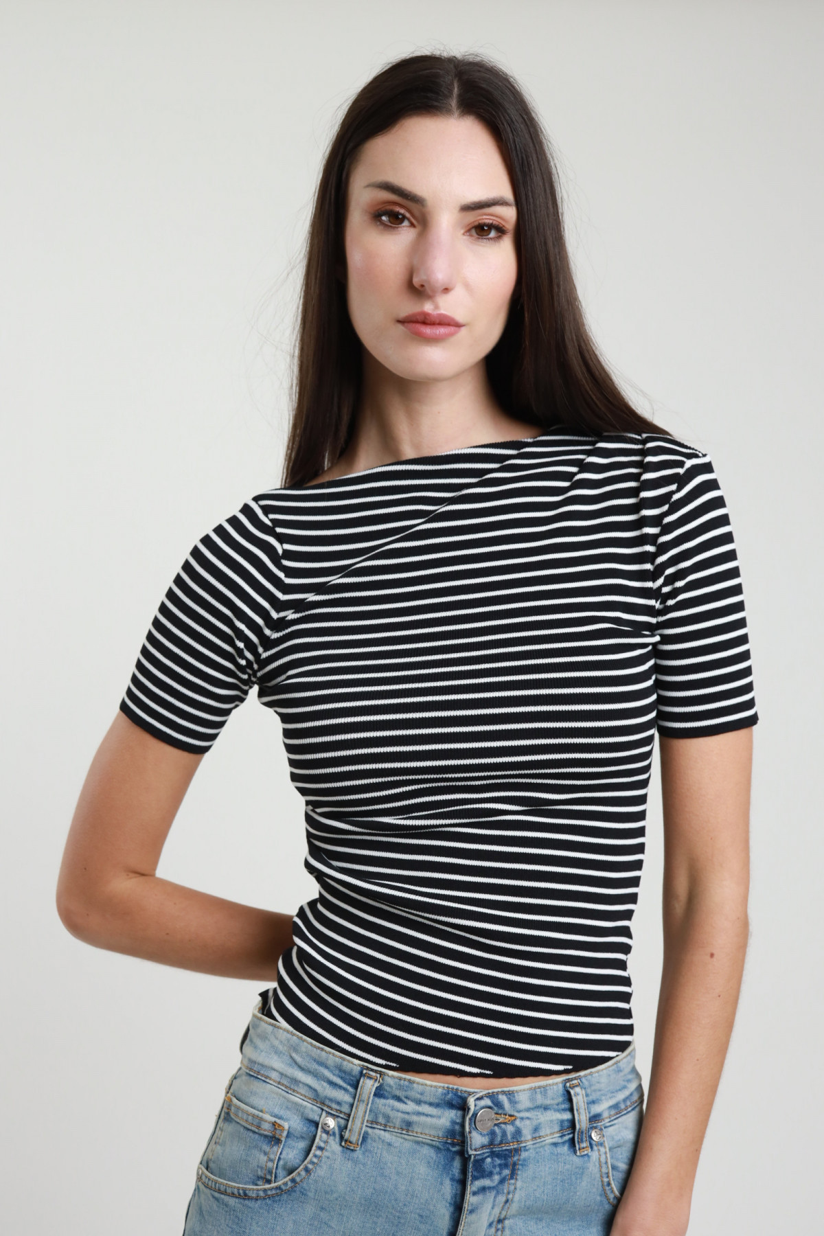 Half-sleeved T-Shirt in a striped pattern with darts on the shoulder and asymmetrical neckline. 80%vi 20%ny