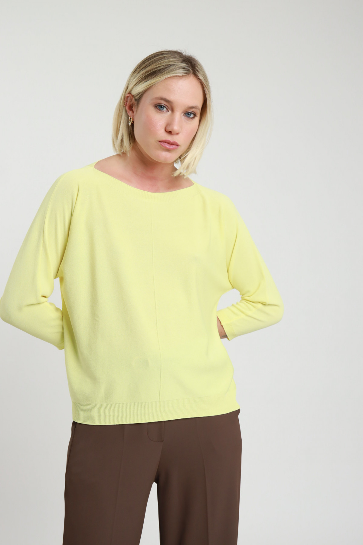 Pullover im Vollstrick, leichter U-Boot-Ausschnitt mit Seitenschlitzen. 100 % co