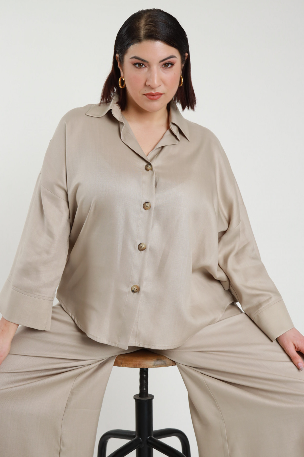 Completo con Blusa a Maniche Corte e Scollo a V, Pantaloni ad Ovetto con Tasche a Portafoglio, Elastico in Vita e Cucitura Asimettrica - Linea Curvy Susy Star.