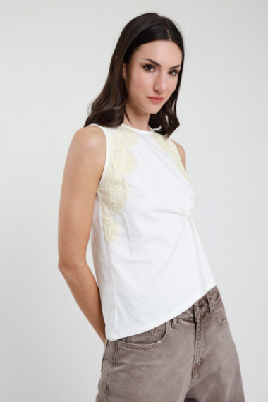 Asymmetrisches, ärmelloses Crop-Top mit Raffung unter der Brust und Spitze am Armloch. 94 % CO 6 % Stück