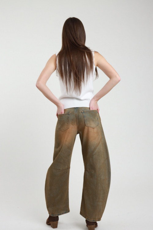 Pantalone in Denim a Banana Wide Leg Lavaggio Effetto Vintage Color Terra, Vita Media con Chiusura Bottone e Zip.