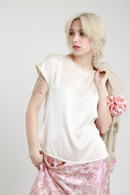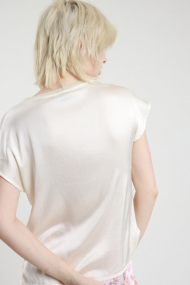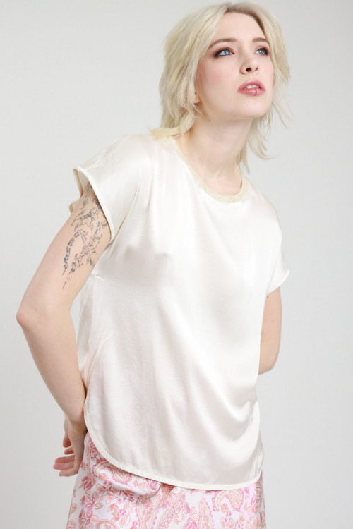Bluse aus Stretch-Viskose mit Satineffekt, Rundhalsausschnitt mit Lurex und kurzen Ärmeln. 97 %vi 3 %ea