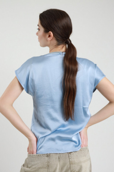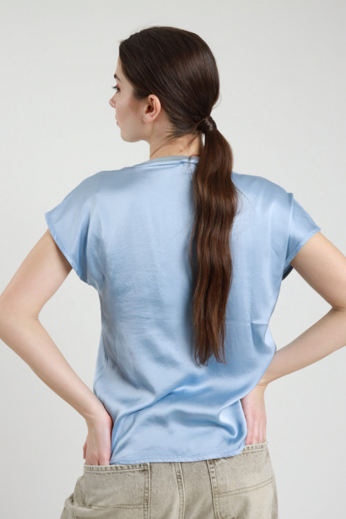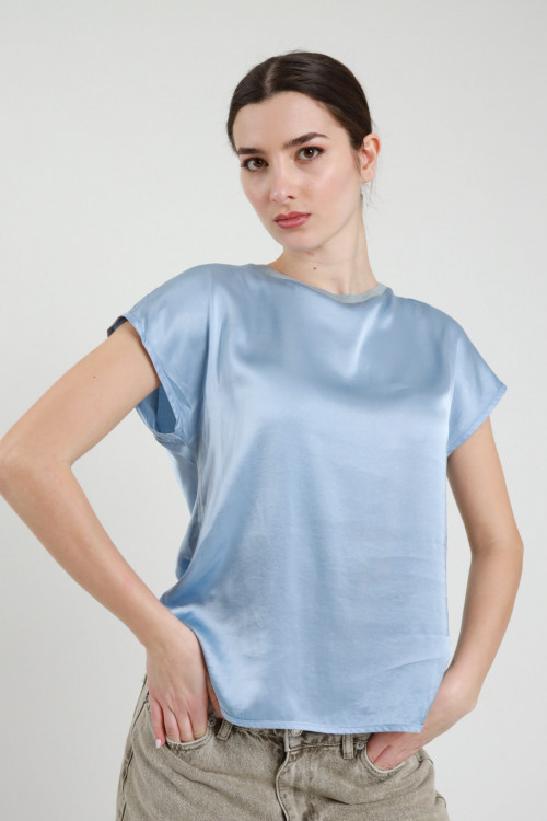 Bluse aus Stretch-Viskose mit Satineffekt, Rundhalsausschnitt mit Lurex und kurzen Ärmeln. 97 %vi 3 %ea