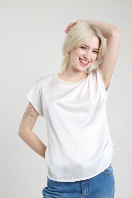 Bluse aus Stretch-Viskose mit Satineffekt, Rundhalsausschnitt mit Lurex und kurzen Ärmeln. 97 %vi 3 %ea