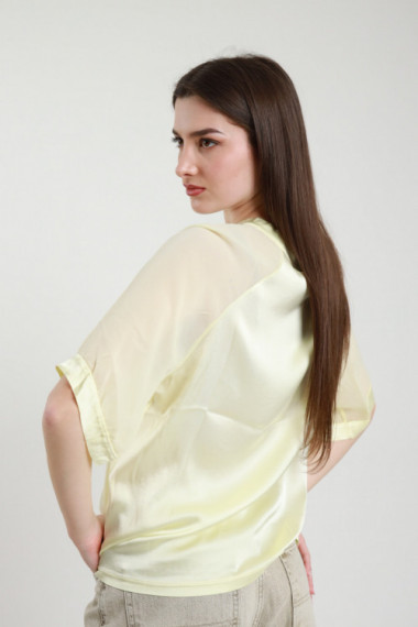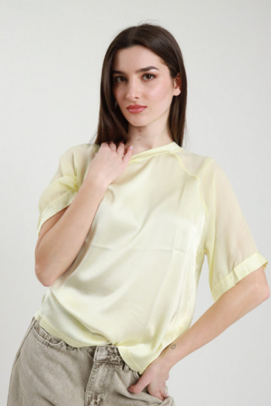 T-shirt Over Girocollo in Viscosa Elasticizzata, Effetto Raso con Inserto sulle Maniche in Georgette Semitrasparente. 97%vi 3%ea
