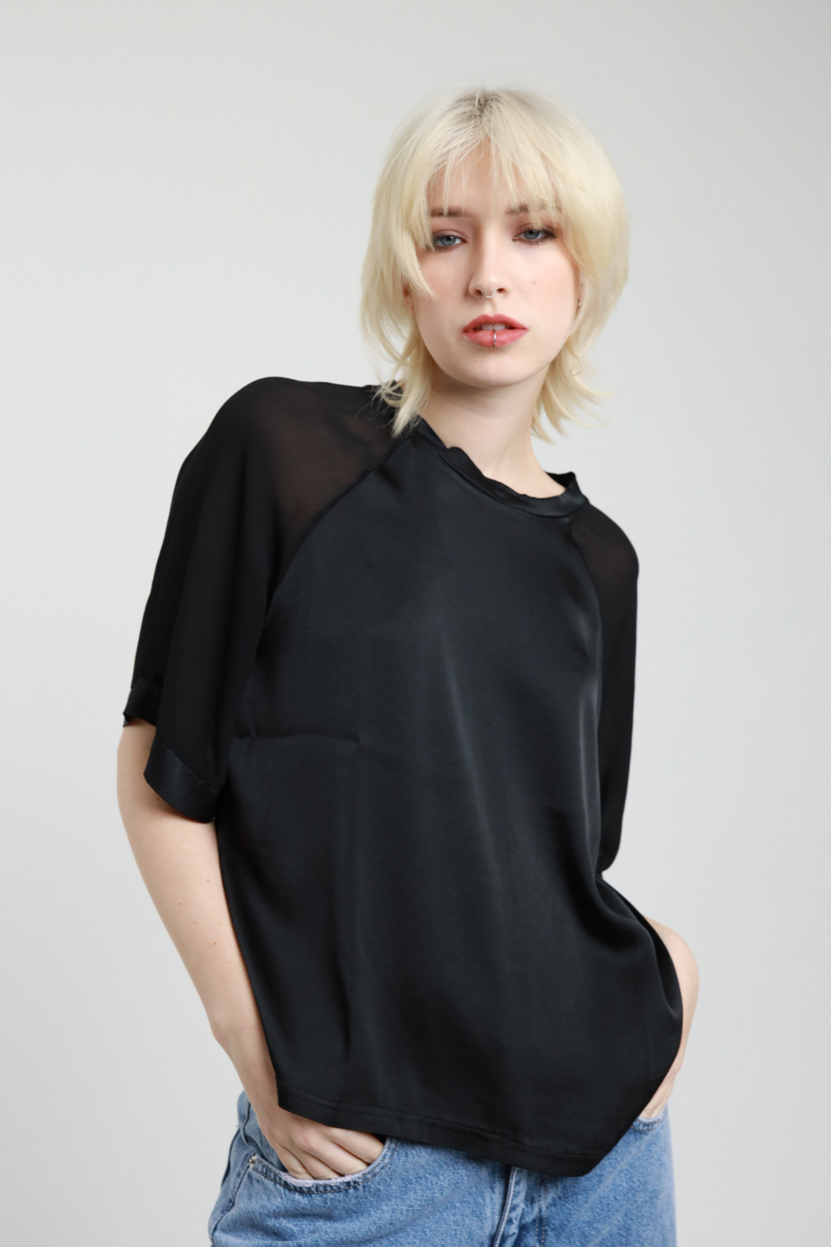 T-shirt Over Girocollo in Viscosa Elasticizzata, Effetto Raso con Inserto sulle Maniche in Georgette Semitrasparente. 97%vi 3%ea