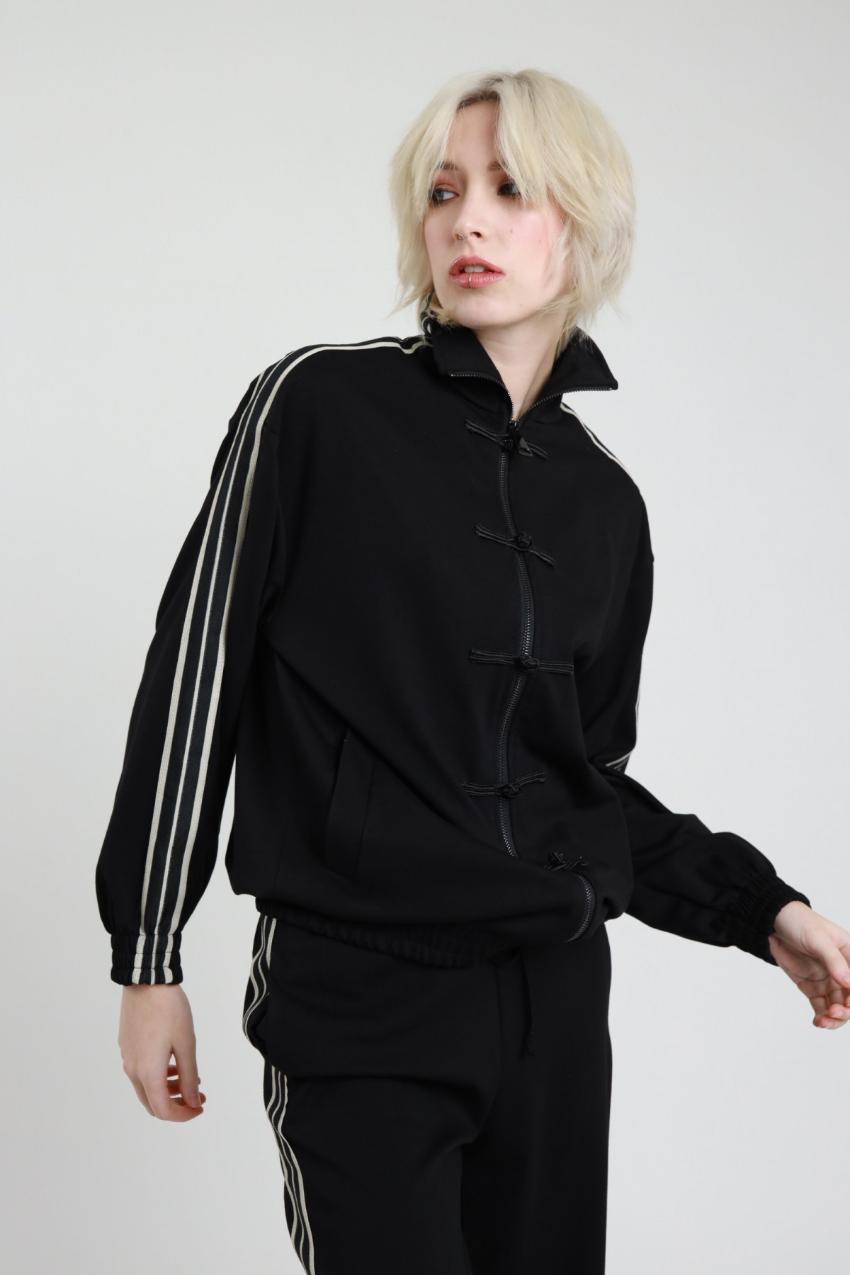 Felpa con Colletto Alto e Bande Laterali, Chiusra Zip e Alamari.
