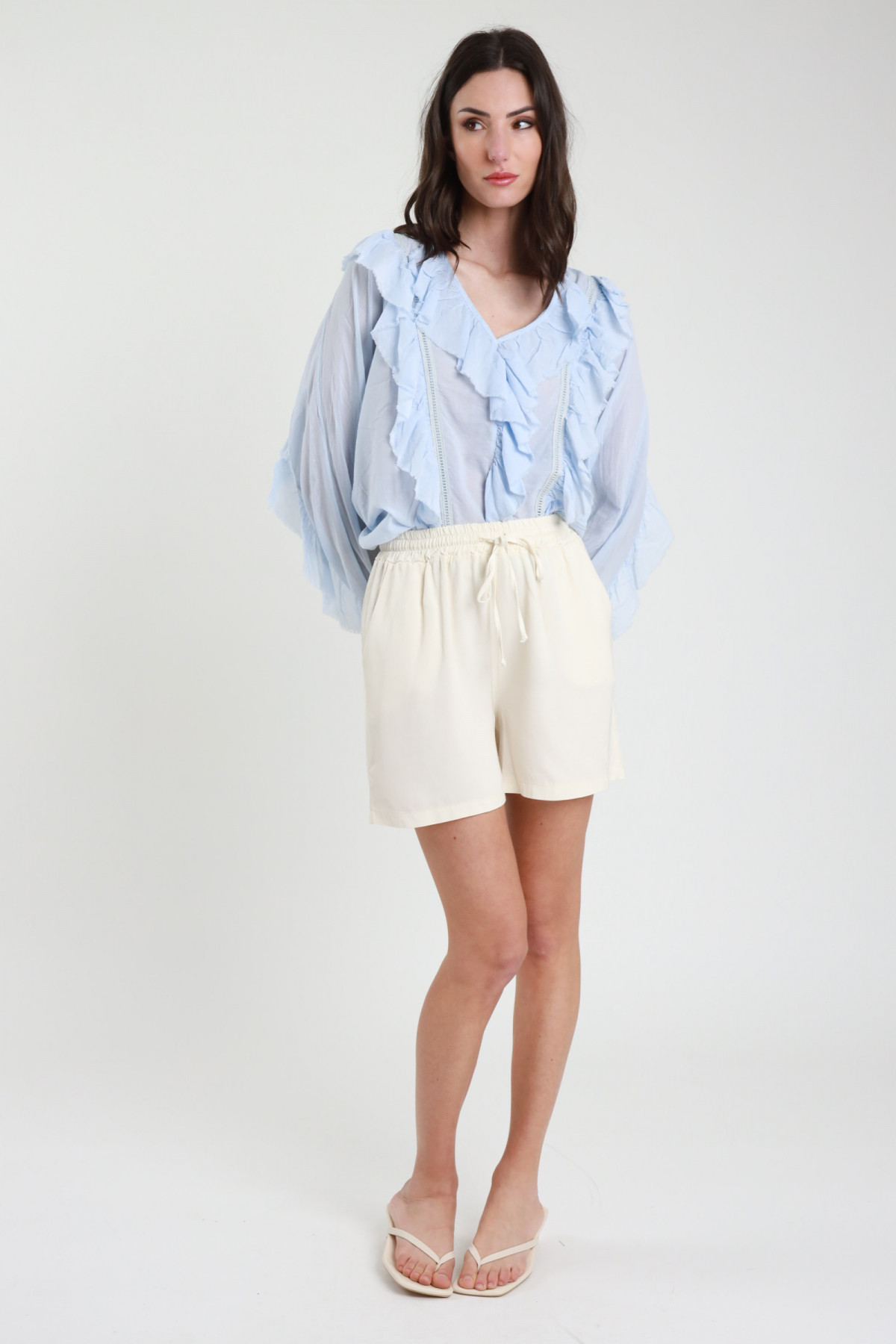 Wide palazzo trousers, elastic waist with drawstring, wallet pockets on the front and large square pockets on the back. 55%li 45%vi