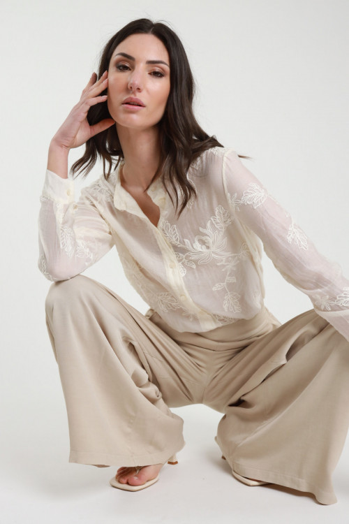 Wide palazzo trousers, elastic waist with drawstring, wallet pockets on the front and large square pockets on the back. 55%li 45%vi