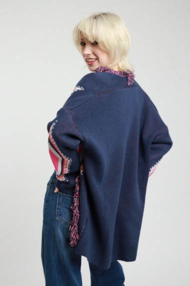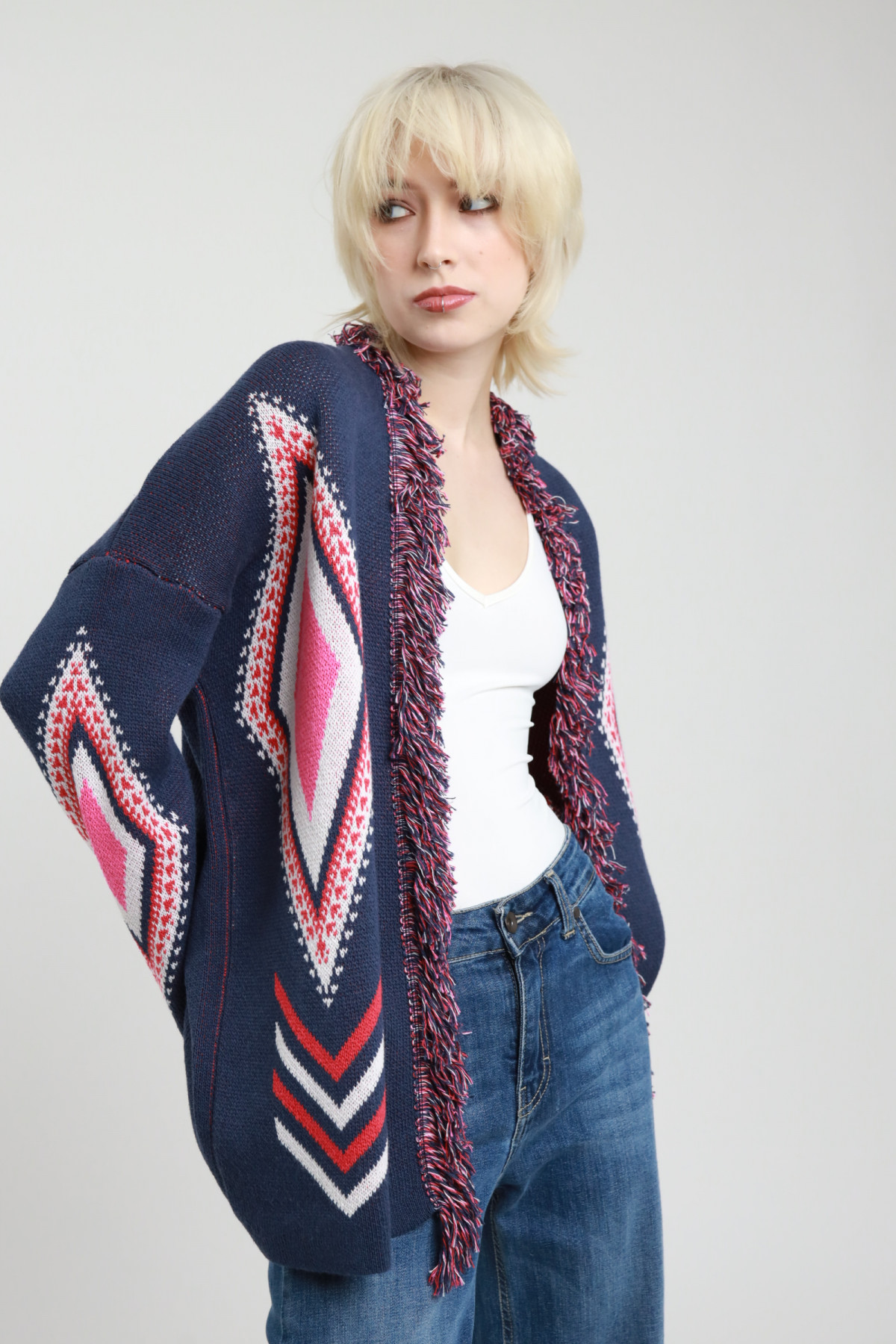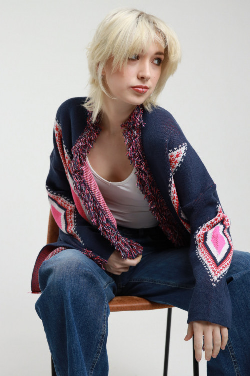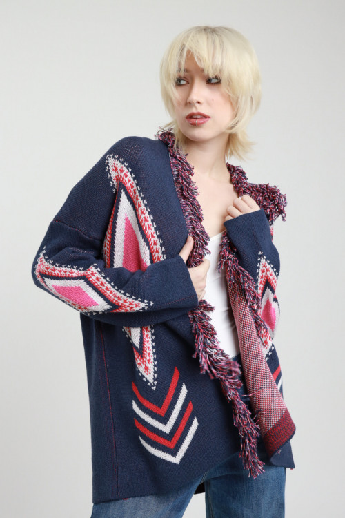 Offener Cardigan mit Fransen an den Enden in Jacquardwebung. 50 % CO 50 % AC