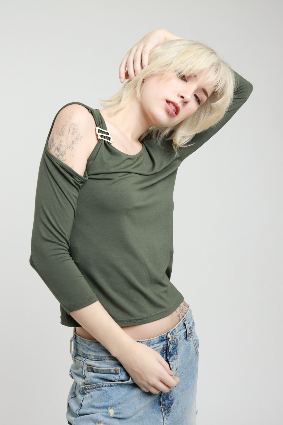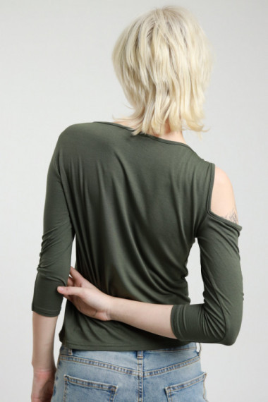 Maglia in Viscosa Elasticizzata con Maniche 3/4 e Cut-Out sulla Spalla con Accessorio Dorato. 94%vi 6%ea