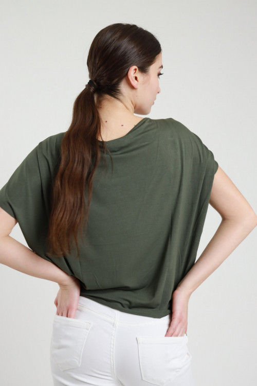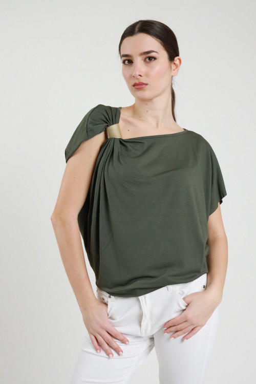 Asymmetrisches T-Shirt aus Stretch-Viskose mit goldenem Accessoire an der Schulter. 94 %vi 6 %ea