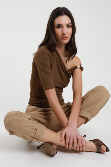 One-Shoulder-Shirt mit 3/4-Ärmeln und goldenem Schmuckdetail. 94 %vi 6 %ea